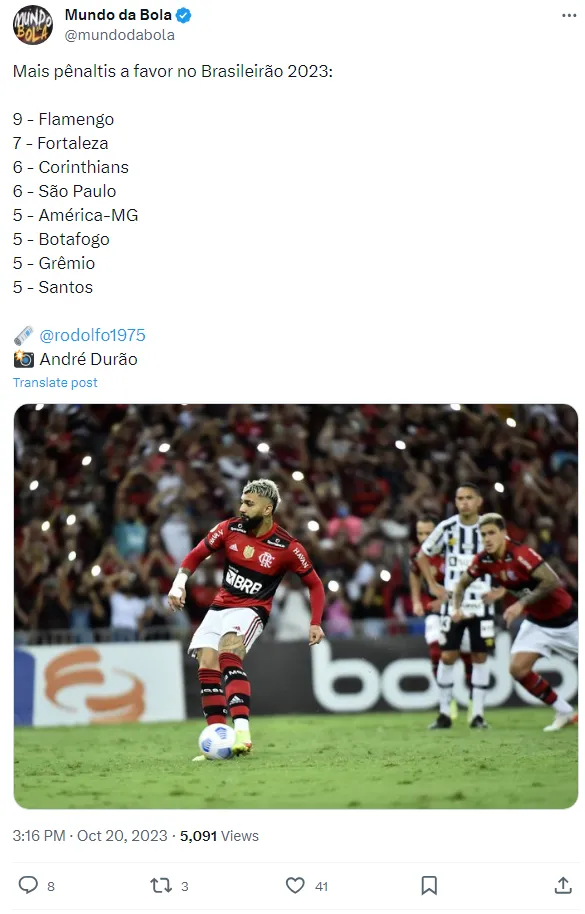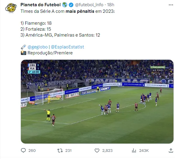 Em uma publicação recente, o Espião Estatístico do GE divulgou uma lista das equipes da Série A do Brasileirão que mais tiveram pênaltis a seu favor em 2023.