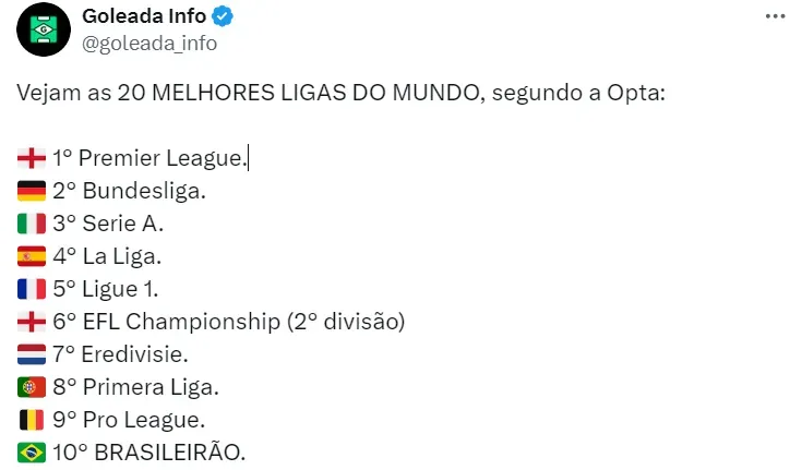 O Brasileirão ficou apenas na 10º posição do ranking das melhores ligas, segundo o portal inglês. A liga Nacional Brasileira é superada até mesmo pela Championship (segunda divisão da Inglaterra).