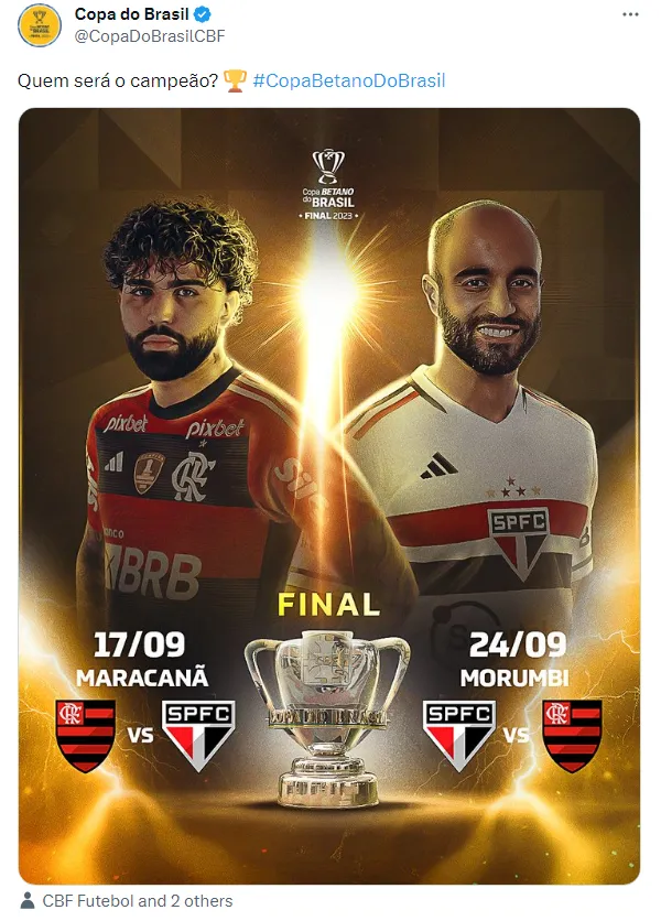 Neste domingo, dia 17 de setembro de 2023, terá início a tão esperada final da Copa do Brasil. O confronto desta edição será entre Flamengo e São Paulo. O primeiro jogo acontecerá no icônico Estádio do Maracanã, no Rio de Janeiro, enquanto o jogo de volta está marcado para o dia 24 de setembro, no Estádio do Morumbi, em São Paulo.