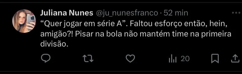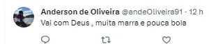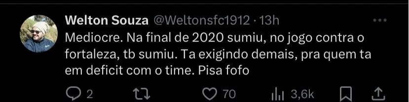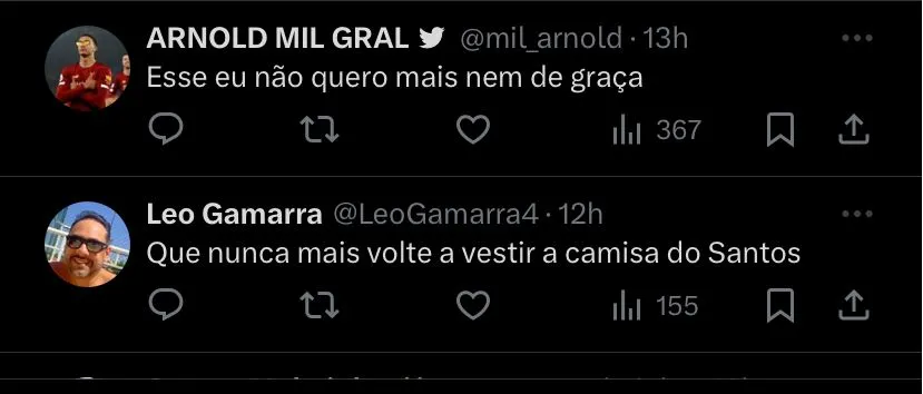 “Esse eu não quero nem de graça” , “Maior vergonha que a 10 na série b foi um jogador desse usando a 10 do Pelé” , “Suma o quanto antes” , “Se jogasse bola e não pipocasse na reta final, estaria na série A sem redução de salário. Mas pode vazar e fazer palhaçada em POA ou Caracas” , “Paulo Turra sempre teve razão”, “Quer jogar a série A, depois de literalmente não dar quase nada de si nos momentos mais importantes do clube! O mais ingrato até agora”.