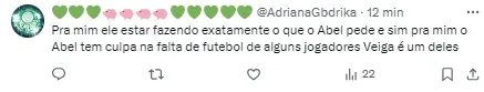 Veiga admitiu que não vive um bom momento no Palmeiras: “Reconhecer os momentos de dificuldades é o que nos faz estar sempre buscando evoluir e crescer. Sei do meu momento e vou continuar me dedicando para melhorar. Jamais fugirei das minhas responsabilidades e nunca me esconderei delas”.
