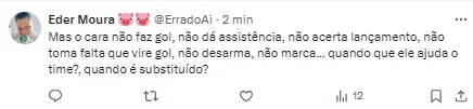 “Antes de qualquer cobrança de fora, tem a minha cobrança, a minha pressão. Eu sei quando eu fiz um bom jogo ou não, tenho a cabeça muito boa. Não sou dependente de elogio e também não vou ficar me abalando com a crítica”, desabafou o camisa 23.