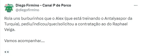 Isso porque, conforme repercutido por Diego Firmino, há rumores de que o técnico Alex de Souza teria pedido ao Antalyaspor a contratação de Raphael Veiga.