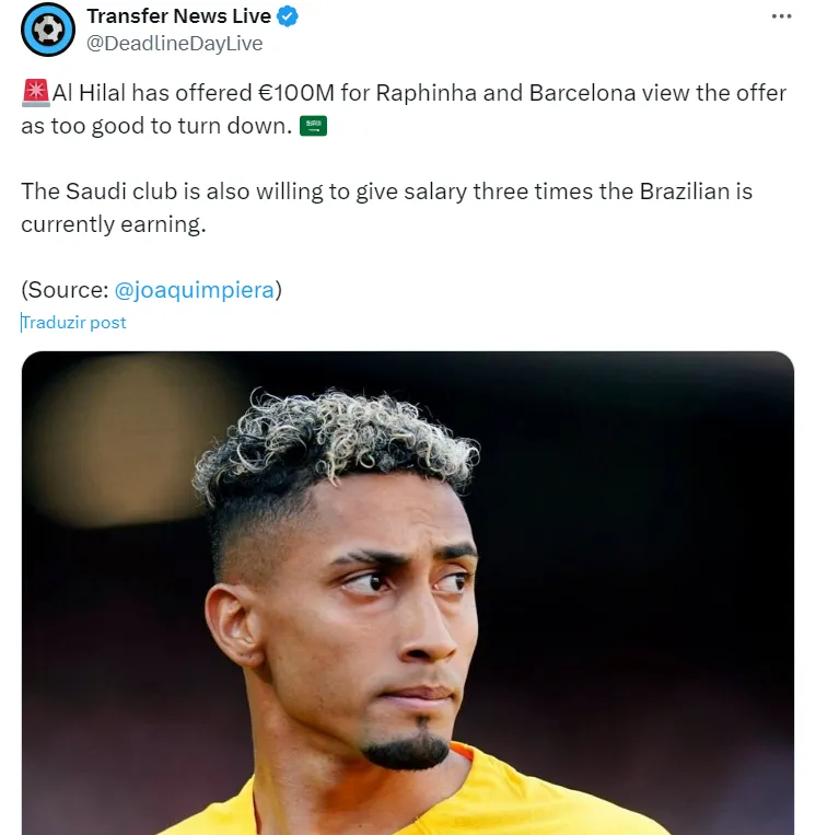 O Barcelona considerada seriamente aceitar a oferta milionária do Al Hilal por Raphinha. A temporada do brasileiro é boa, mas as cifras apresentadas é acima daquilo que imaginava o Barça.