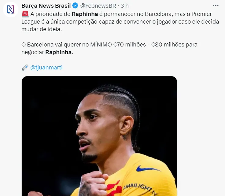 O Barcelona busca negociar o futebol do atacante brasileiro em meio à necessidade de fazer dinheiro com a venda de jogadores. O entendimento é que Raphinha é um jogador bastante valioso no mercado.