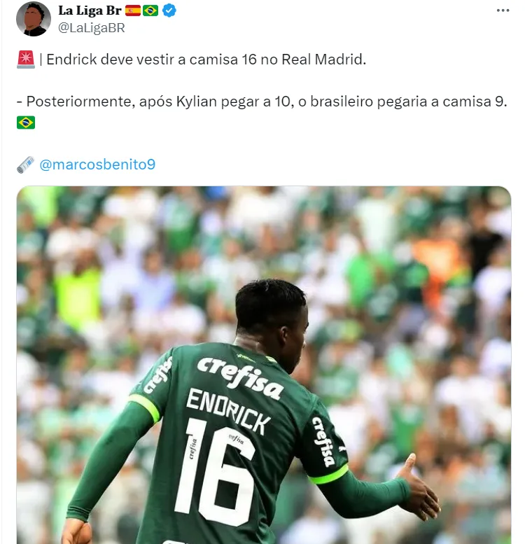 Endrick tinha o desejo de ser o camisa 9 do Real Madrid, tanto por ser um número que ele gosta quanto por fazer sentido com a posição de origem. No entanto, segundo informa Marcos Benito, periodista do canal El Chiringuito TV, os merengues teriam definido que o brasileiro usará a camisa de número 16.