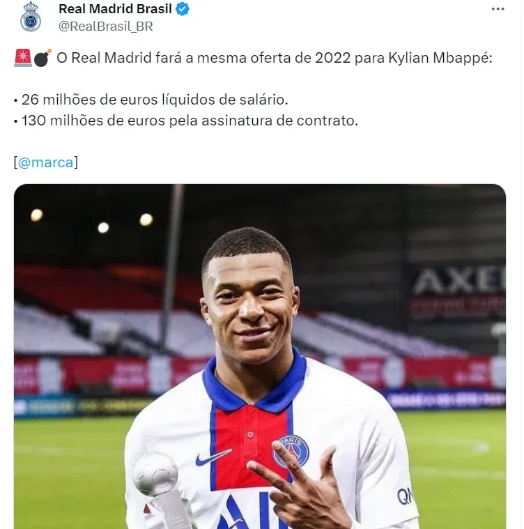 O Real Madrid prepara uma oferta de 130 milhões de euros para convencer Mbappé a assinar com o time de Ancelotti em 2024. Esse valor é igual ao apresentado em 2022. Naquela oportunidade, Mbappé recusou.