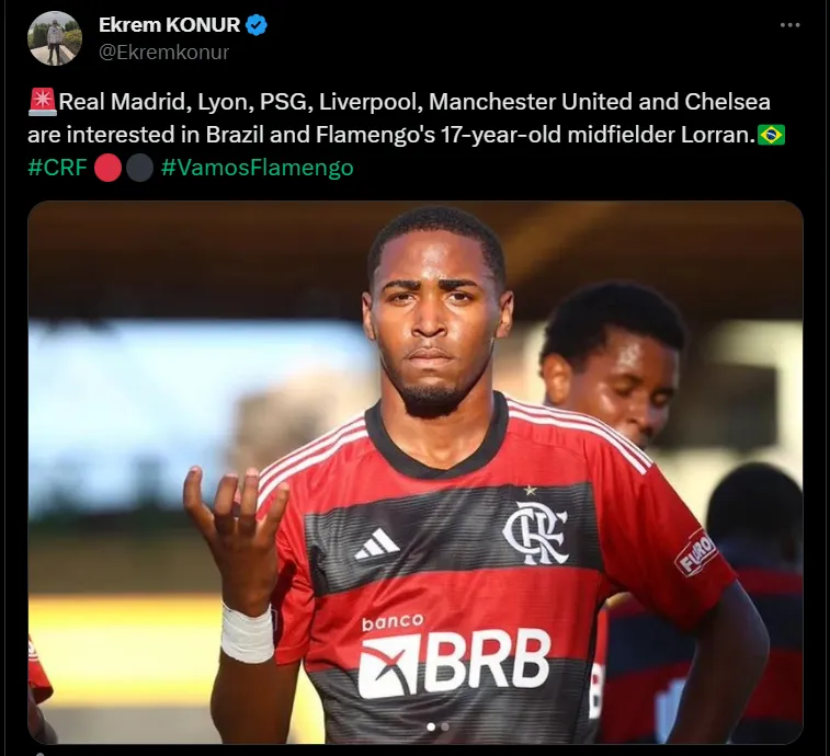 De acordo com as informações publicadas pelo jornalista Ekrem Konur, o Real Madrid, PSG, Liverpool, Manchester United, Lyon e Chelsea tem interesse na contratação do meio-campista Lorran, de apenas 17 anos.