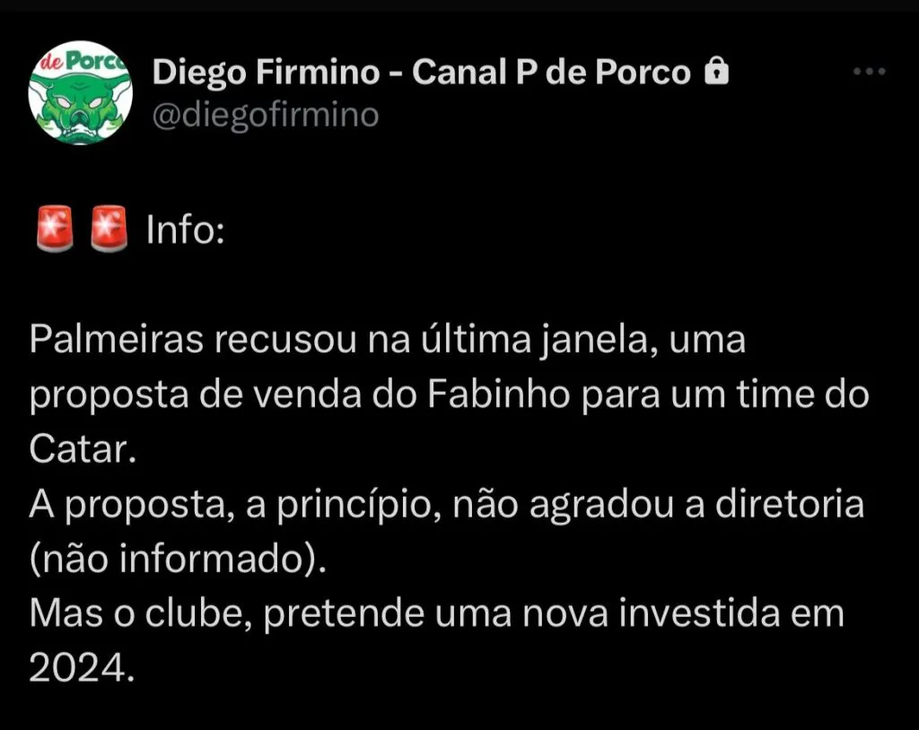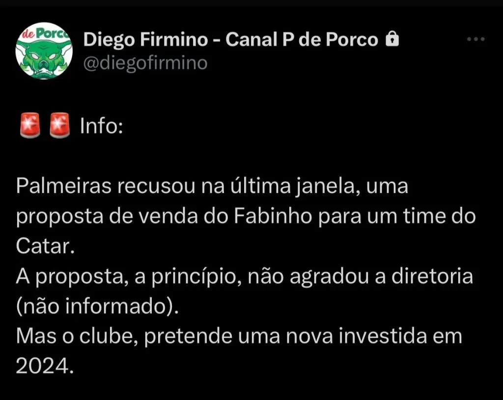 Segundo informações do jornalista Diego Firmino, o Palmeiras pode perder o volante Fabinho na próxima temporada. Ele teria recebido oferta do Catar na última janela de transferências, recusada pelo Palmeiras.