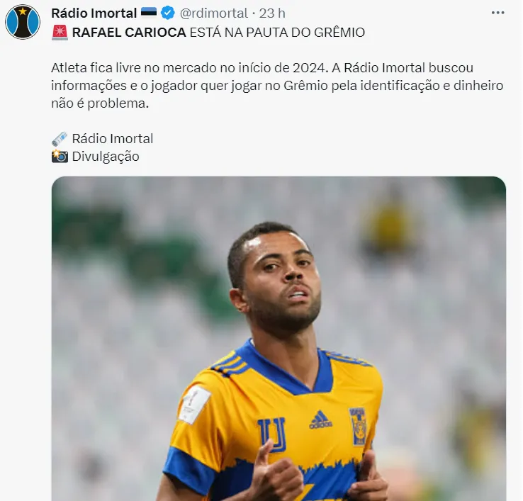 Outro jogador que atua no futebol mexicano, Rafael Carioca foi oferecido ao Grêmio nos últimos dias, aponta o portal Revista Colorada. Ex-Atlético-MG, ele defende as cores do Tigres, grande clube local.