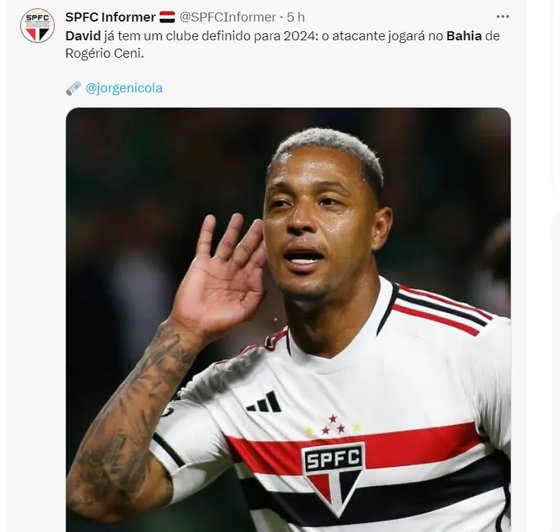 Jogador do Internacional, David, que está emprestado ao São Paulo, tem tudo para jogar no Bahia em 2024, conforme conta Nicola. A fonte informa que, dentro do clube paulista, eles já estão cientes de que David vai jogar no Bahia de R. Ceni.