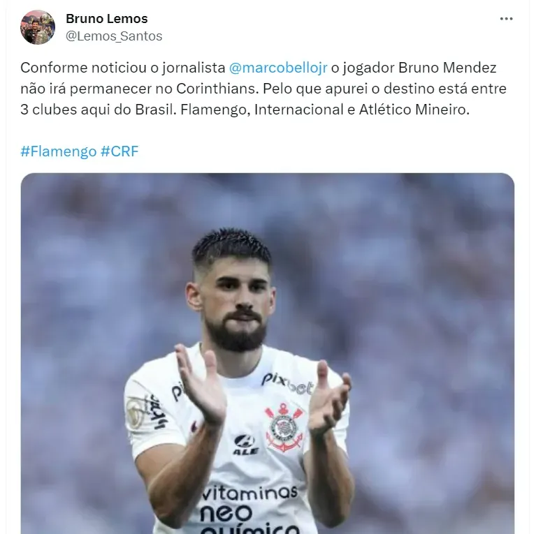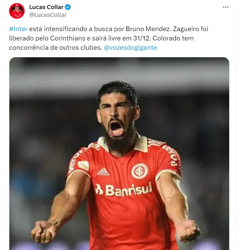 Ciente de que Bruno Mendez deixará o Corinthians, o Internacional pode ser o destino do defensor em 2024, como informa Lucas Collar. De acordo com ele, o Inter intensificou a busca por Mendez.