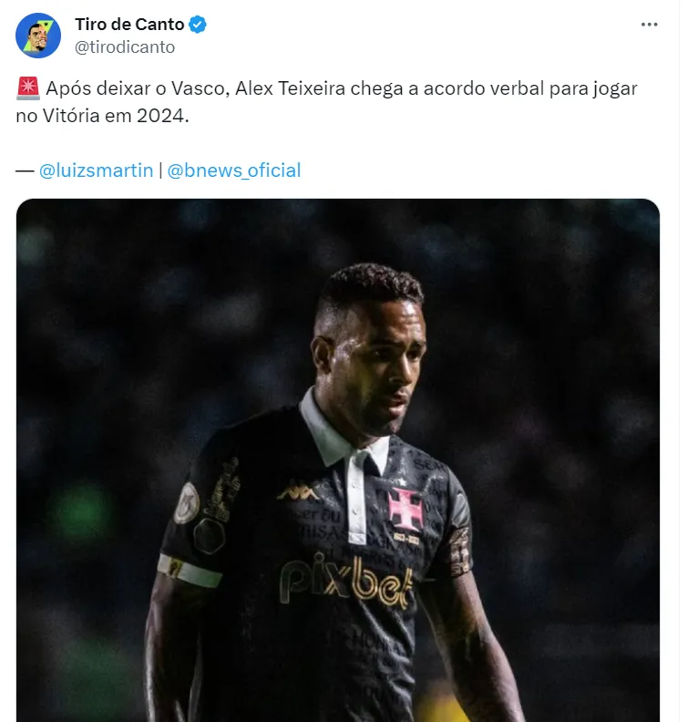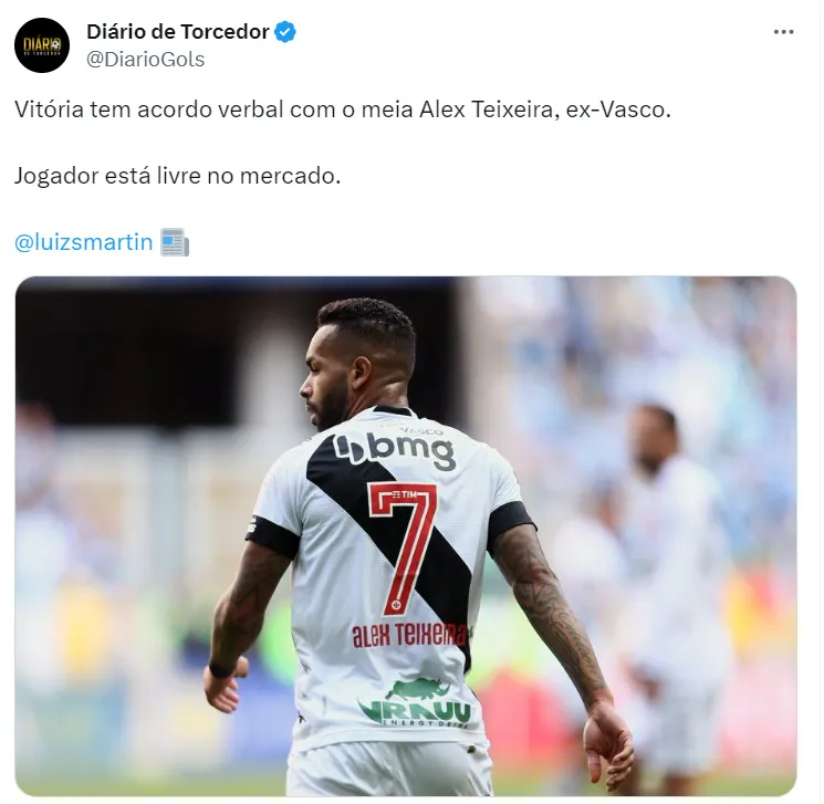 Com dois nomes fechados, o Vitória tem um acordo verbal com Alex Teixeira, que está em fim de contrato com o Vasco e chegará ao clube nordestino sem custos, pois ele não terá seu vínculo renovado junto ao clube carioca.