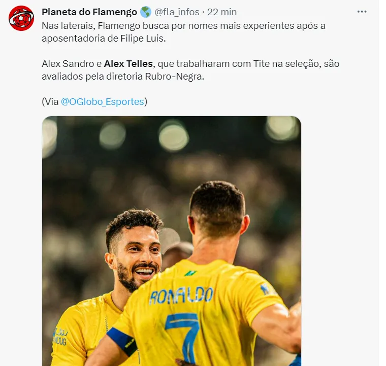 O lateral Alex Telles, brasileiro, ex-Manchester United e, hoje, no Al Nassr, atuando com Cristiano Ronaldo, está mira do Flamengo para o ano de 2024.
