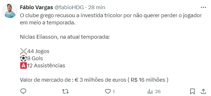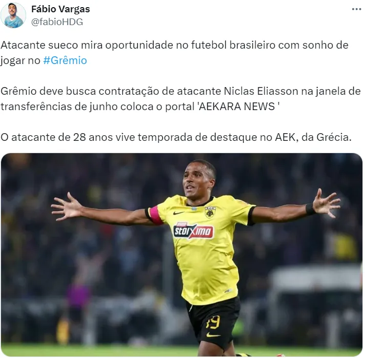 Ainda de acordo com a fonte, Niclas Eliasson tem o desejo de jogar no futebol brasileiro e sonha com a oportunidade de vestir as cores do Grêmio. Ele que tem nacionalidade brasileira, mas nunca jogou no país.