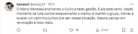 “O presidente Duílio tem conduzido bem essa questão internamente. É difícil em momento de eleição. A gente tem tentado separar isso bem, conversei com ele e a direção atual para que a gente não adiantasse nenhum assunto relativo à reformulação, entrada e saída de jogadores. Isso seria péssimo para momento que a gente estava atravessando.”