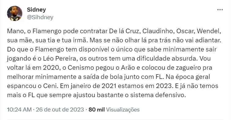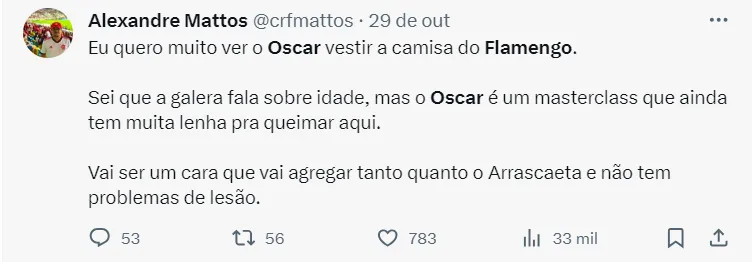 Por fim, o Flamengo tem Oscar como seu grande sonho de consumo. O meio-campista, atualmente atuando na China, é alvo de interesse do gigante carioca, e, naturalmente, tentativas de contratação devem ser feitas para 2024.