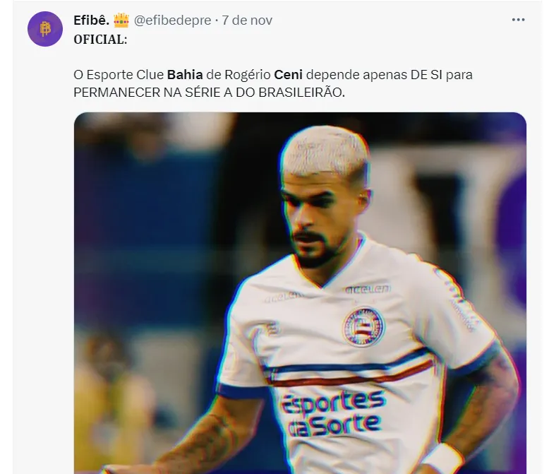 De acordo com Nicola, David será reforço do Bahia em 2024. O jogador atua pelo São Paulo, emprestado pelo Inter. No próximo ano, mesmo se o Bahia for rebaixado, David será jogador do clube.