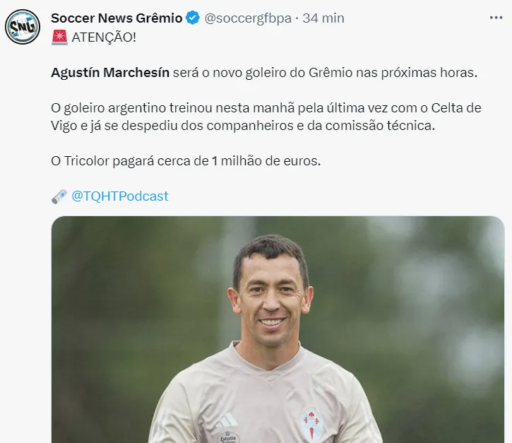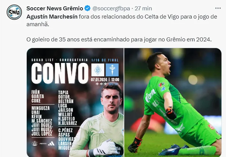 De olho em um centroavante, o Grêmio está acertando a contratação do goleiro Agustín Marchesín, de 35 anos de idade, goleiro do Celta de Vigo. De acordo com informações da mídia de fora (TQHTPodcast), o anúncio deve acontecer nas próximas horas.