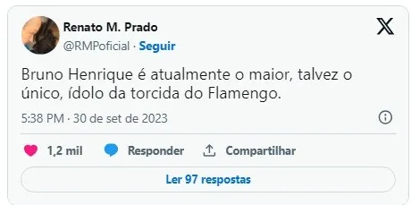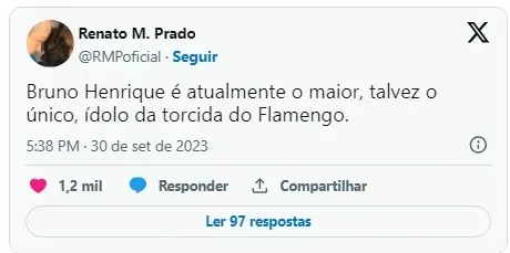 “Bruno Henrique é atualmente o maior, talvez o único, ídolo da torcida do Flamengo”, opinou RMP em sua rede social, no último sábado (30).