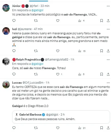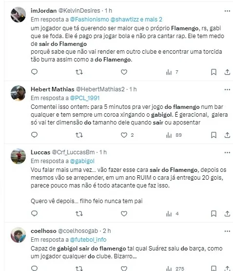 “Eu espero que o Tite tente colocá-lo na linha. Mas ele não precisa do Gabriel, o Pedro é o titular dele. O Tite é o primeiro treinador que bota, assumidamente, o Gabriel no banco. Os outros botaram em um jogo, mas voltava no outro. O Gabriel não foi titular nenhuma vez com o Tite, e o Pedro voltou a jogar bem. O Gabriel, nesse momento, não é tão fundamental para o Flamengo. Se o Tite acertar esse time com o Pedro no comando do ataque, eu não vou me espantar se o Gabriel acabar saindo,” comentou Renato Maurício Prado no programa Fim de Papo.