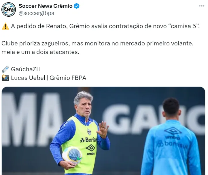 A pedido do técnico Renato Gaúcho, a diretoria do Grêmio tem interesse na contratação de um novo camisa 5 para a disputa da Libertadores de 2024, competição que o Tricolor começou tropeçando.