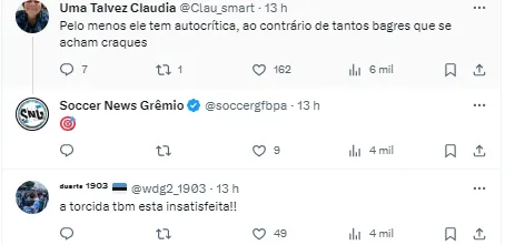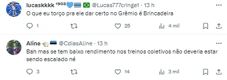 A torcida não perdeu tempo e se manifestou nas redes sociais sobre a situação do jogador. “A torcida também está insatisfeita” , “O que eu torço para ele dar certo no Grêmio é brincadeira”, “Aproveite e pede pra sair” , “Uma pena esse cara não ter se encaixado aqui ainda, futebol ele tem”.