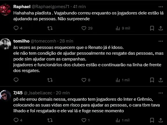“Estávamos sem água no hotel e do Rio de Janeiro vou conseguir mobilizar muito mais pessoas para seguir ajudando. Toda a minha força, meu carinho e meu apoio ao povo gaúcho”, finalizou Portaluppi.