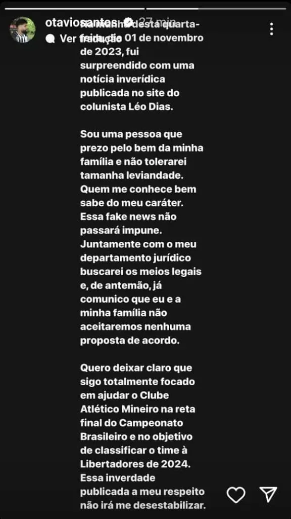 “Quero deixar claro que sigo totalmente focado em ajudar o Clube Atlético Mineiro na reta final do Campeonato Brasileiro, no objetivo de classificar o time à Libertadores de 2024. Essa inverdade publicada ao meu respeito não irá me desestabilizar“, escreveu.