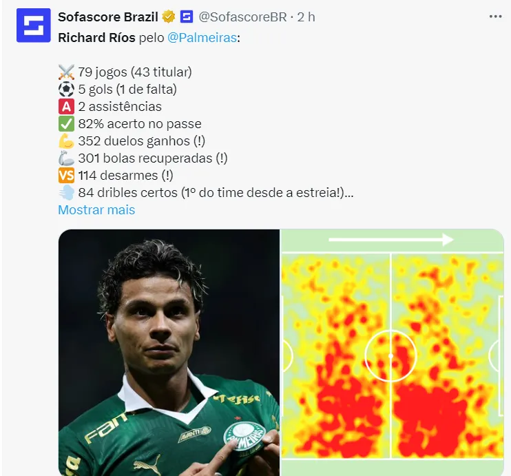 Richard Ríos é avaliado em 3 milhões de euros (R$ 16 milhões). Contratado em 2023, o Palmeiras renovou o vínculo do meio-campista até 2026. Não existe oferta neste momento. A informação vem do portal italiano LaViola.