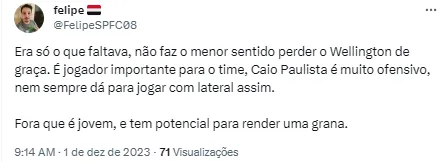 Welington ainda vive uma incerteza sobre seu futuro, já que outros jogadores renovaram o contrato após a conquista da Copa do Brasil. Para a posição, o clube vai comprar Caio Paulista, por exemplo.