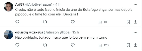 Enquanto isso, o jogador segue no Botafogo. Ele que, nesta temporada, soma oito jogos disputados, com um gol e duas assistências. Em 2023, foram 36 participações em gols em 54 partidas.