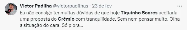 Apesar de ter fechado com Diego Costa, o clube gaúcho segue em busca de um nome de peso para o setor. Entretanto, publicamente, o Grêmio nega a chance de contratar Tiquinho.