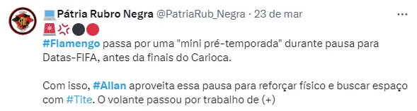Entretanto, ainda segundo a publicação, o Flamengo não se animou com a possibilidade, pois Tite conta com Allan para o elenco. Além disso, o meio-campista está feliz na Gávea.