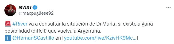 Isso porque, de acordo com Hernán Castillo, o River Plate vai tentar a contratação de Di María para o meio do ano. A ideia do time é saber, inicialmente, sobre a disponibilidade de voltar à Argentina.
