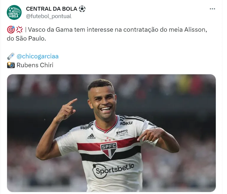 Destaque, Alisson é o mais novo alvo do Vasco no mercado da bola, segundo informações de Chico Garcia. O jornalista não entra em grandes detalhes, mas informa que o clube carioca está interessado no jogador do São Paulo.
