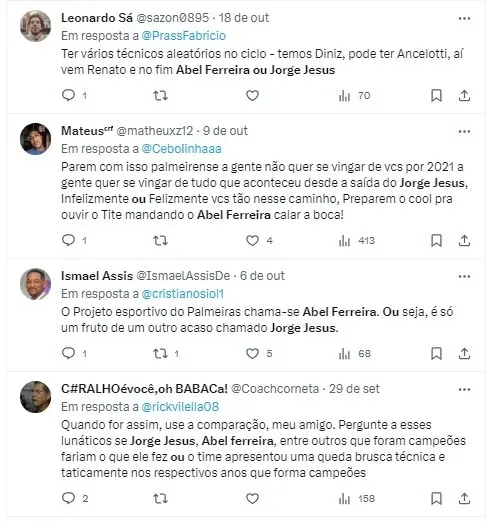 “O Jorge Jesus é o maior técnico da história do Flamengo, quem ganhou a Libertadores e o Brasileiro no mesmo ano. A mesma coisa no Palmeiras, das três Libertadores o Abel ganhou duas. Diante disso, não tem como fugir em termos de resultados, o Abel é o maior treinador da história do Palmeiras. Assim como, o Jorge Jesus em relação ao Flamengo. disse RMP.