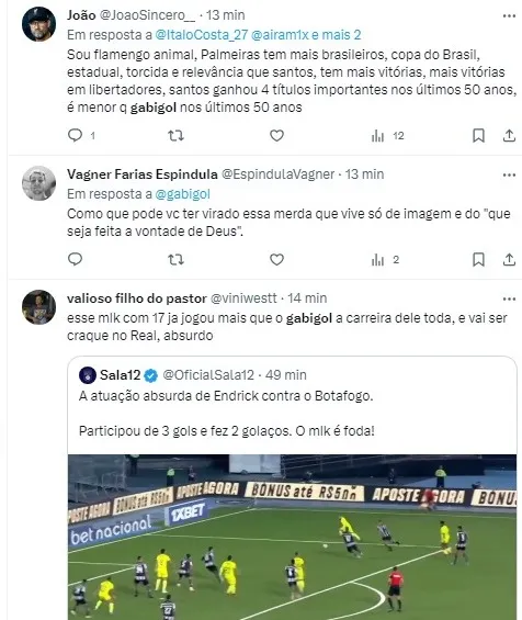 “É uma situação desesperadora do Flamengo, porque os seus jogadores históricos não conseguem mais jogar coisa nenhuma. O Gabriel (Barbosa) parece um ex-jogador. Ele entra e mal toca na bola, não ganha uma dividida, não chega em um rebote do goleiro. É inacreditável. A sensação que tenho é que é o sósia dele que está jogando. Lembra do Gabigordo? Acho que é ele que está jogando e estamos sendo enganados. O Gabriel não parece nada com aquele jogador artilheiro, decisivo”. disse RMP.