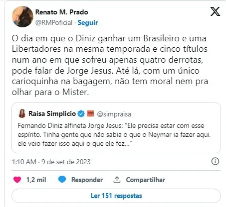 “O dia em que o Diniz ganhar um Brasileiro e uma Libertadores na mesma temporada e cinco títulos num ano em que sofreu apenas quatro derrotas, pode falar de Jorge Jesus. Até lá, com um único carioquinha na bagagem, não tem moral nem pra olhar para o Mister”, disse RMP.