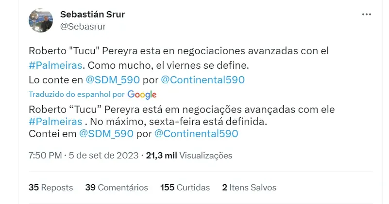 O Palmeiras tem negociações avançadas com o argentino Roberto Pereyra, que está livre no mercado. O jornalista Sebastián Srur não fornece grandes detalhes, mas informa que, no máximo, até sexta-feira, um acordo deve ser selado.