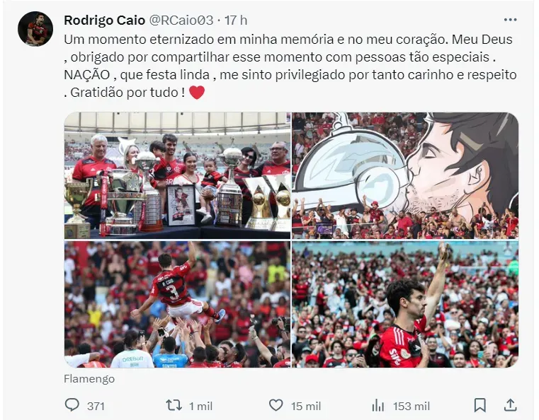 Grande ídolo da história recente do Flamengo, Rodrigo Caio se despediu da torcida no último domingo (3), no Rio de Janeiro, e não jogará mais com as cores do Mengão a partir de 2024.
