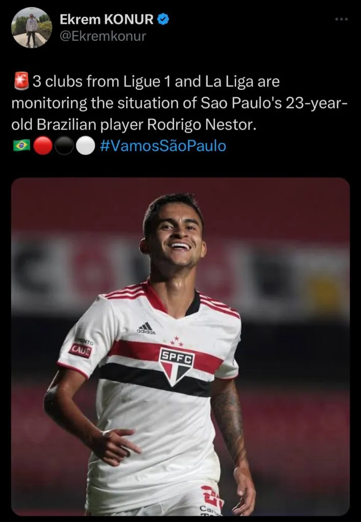 Segundo informações do jornalista Ekrem Konur, o São Paulo pode perder Rodrigo Nestor em 2024. 3 Times da Ligue 1 e LaLiga estão interessados na contratação. As equipes não foram reveladas pelo jornalista.