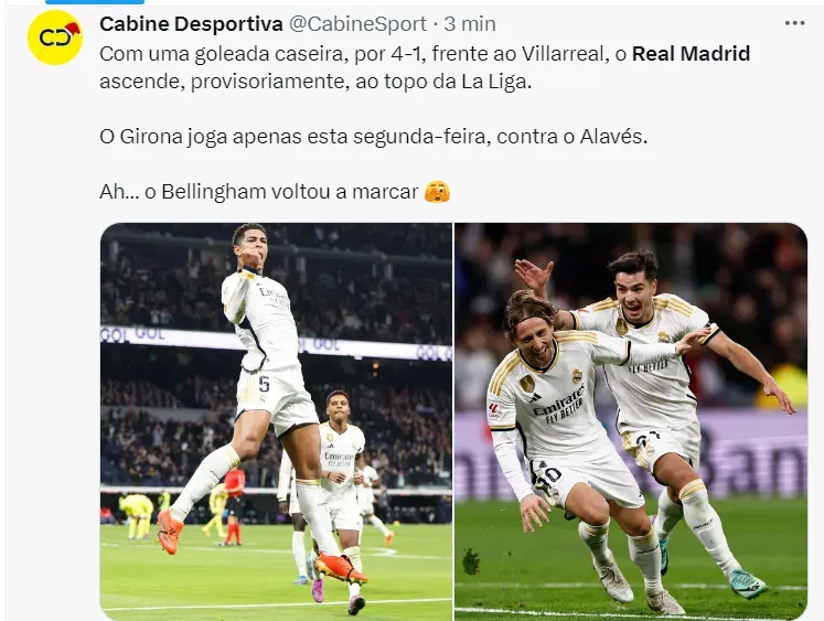 Vivendo grande fase, o inglês Bellingham, considerado, hoje, por muitos, o melhor jogador do mundo, foi às redes. Com mais um gol marcado, o meia chegou à marca de 17 gols em 20 jogos pelo clube merengue.