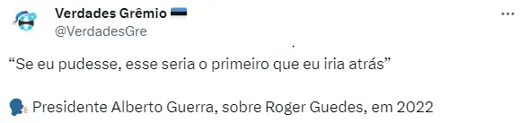 Porém, no futebol brasileiro, Róger Guedes aparece como grande ‘sonho’ de outro presidente: o do Grêmio. Alberto Guerra nunca escondeu desejo em contratar o atleta.