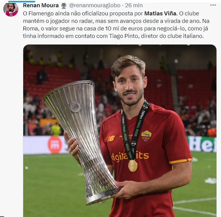 O Flamengo segue de olho no mercado e faz de Viña uma das suas prioridades. A Roma, ciente, está aberta a fazer negócios envolvendo o nome do defensor, mas pede 10 milhões de euros – por esse valor, sem chance do Flamengo concluir a contratação.