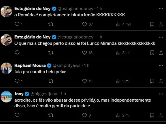 Romário respondeu na mesma hora, elevando o tom com o torcedor: “Toda cobrança justa aceitarei, mas se escrever babaquice aqui vou mandar tomar no c…”, disparou.