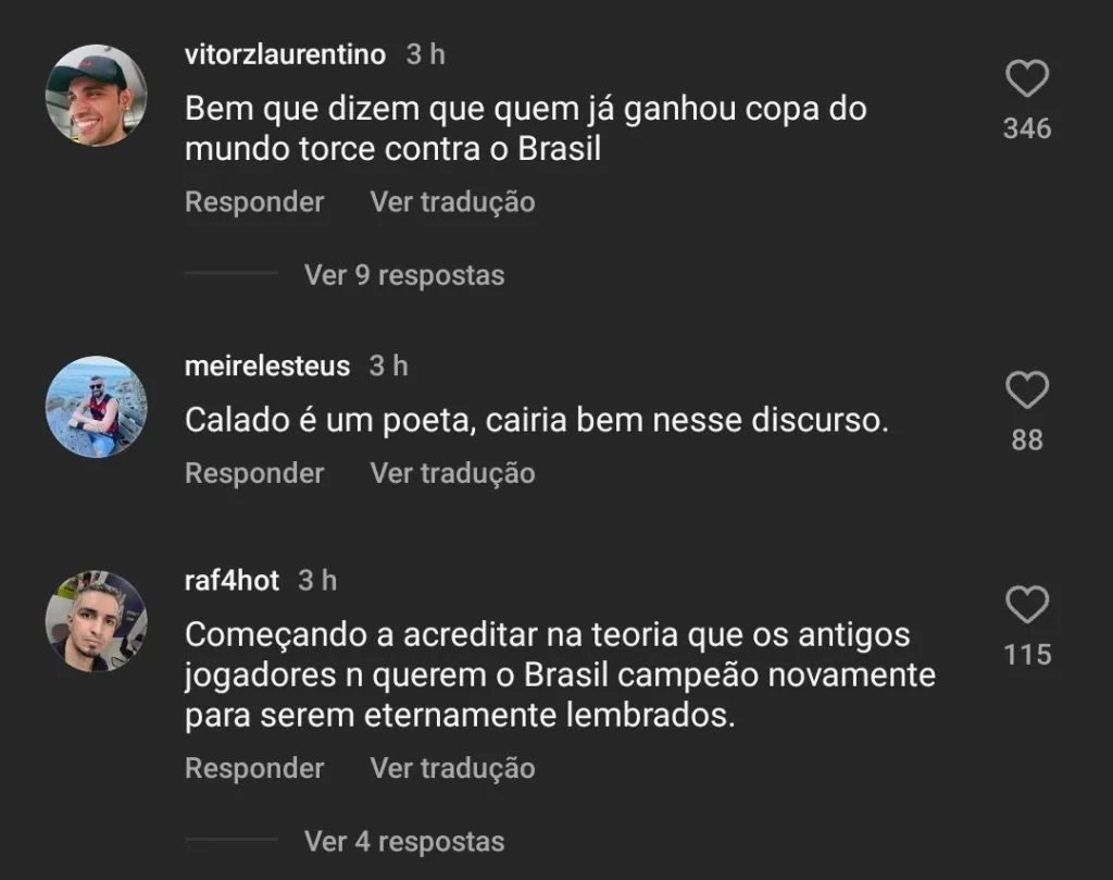 “Na minha humilde opinião, a Seleção Brasileira está em ótimas mãos com Fernando Diniz. Que se f*** o Ancelotti, eu quero ele (Diniz) até o final.“, disse o ex jogador.