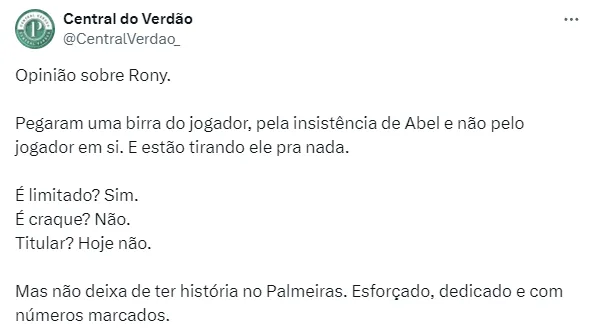 Mas, enquanto isso, o avançado segue atuando pelo Verdão. Na carreira, além de Palmeiras e Athletico, Rony soma passagens por clubes como Náutico, Cruzeiro e Remo.