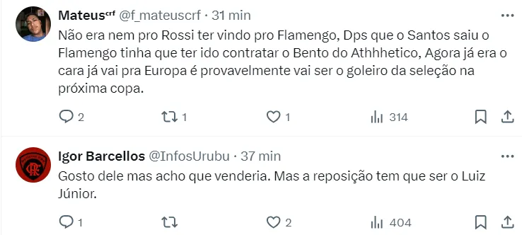 O Flamengo não pretende negociar o futebol de Rossi até pelo menos o fim da atual gestão do presidente Rodolfo Landim. O goleiro é titular de Tite e também está muito feliz no Rio de Janeiro.