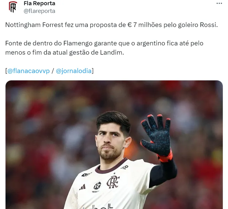 Avaliado em 6 milhões de euros, Rossi tem contrato com o Flamengo válido até 2027. O reserva atual do goleiro é Matheus Cunha, que também foi um alvo recente do clube da Premier League.
